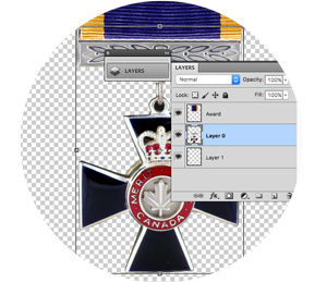Evolving Media had to take each file, open it in Adobe Photoshop and meticulously remove the background, leaving the Order, Decoration and Medal on its own layer in Photoshop. A keyline was added, or working path, around each item to ensure a transparent background when placed into older Quark Xpress publications.
